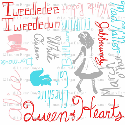 The first thing I like to do is list characters. We have the curious protagonist Alice, the Mad Hatter, the March O'Hare, the White Rabbit, the Cheshire Cat, the Queen of Hearts, Bill the Lizard, and the twins Tweedledee and Tweedledum--as well as several others. When designing my collection, I also listed characters from the sequel Through the Looking Glass. I took my list and created this design by just writing their names and adding some doodles of them.